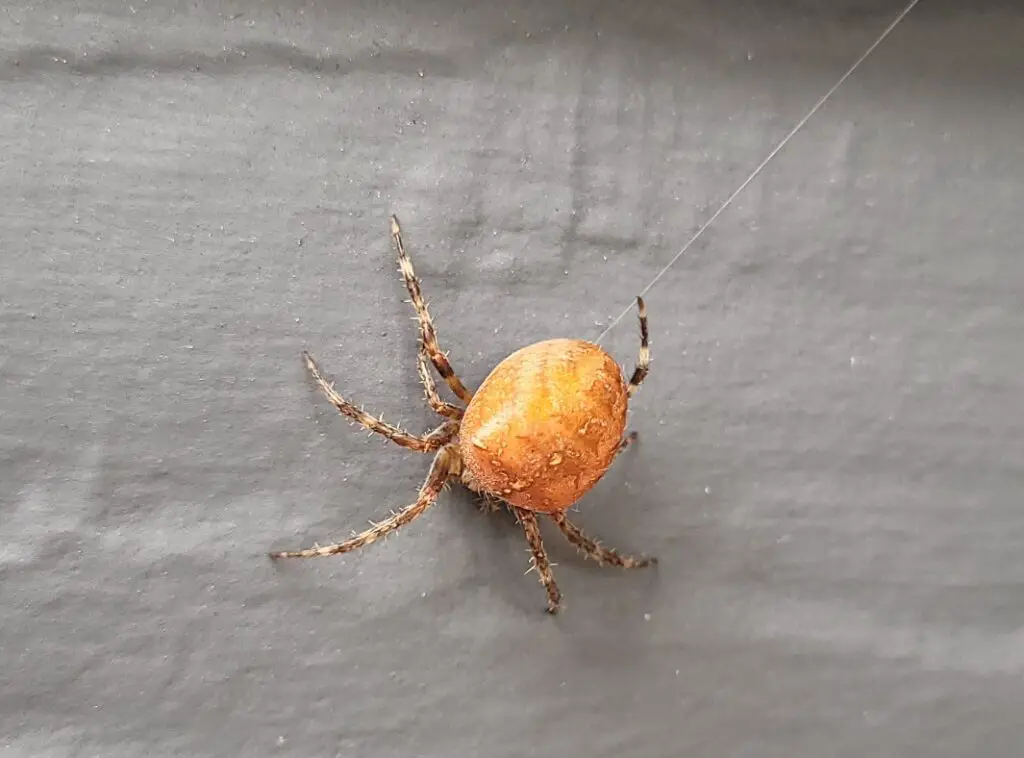 Appears to be missing a leg, raised one up maybe defensively when the wind from my front storm door closing hit it. Body very small, less than the size of a penny. Been here for a couple days on the wall under the light.
